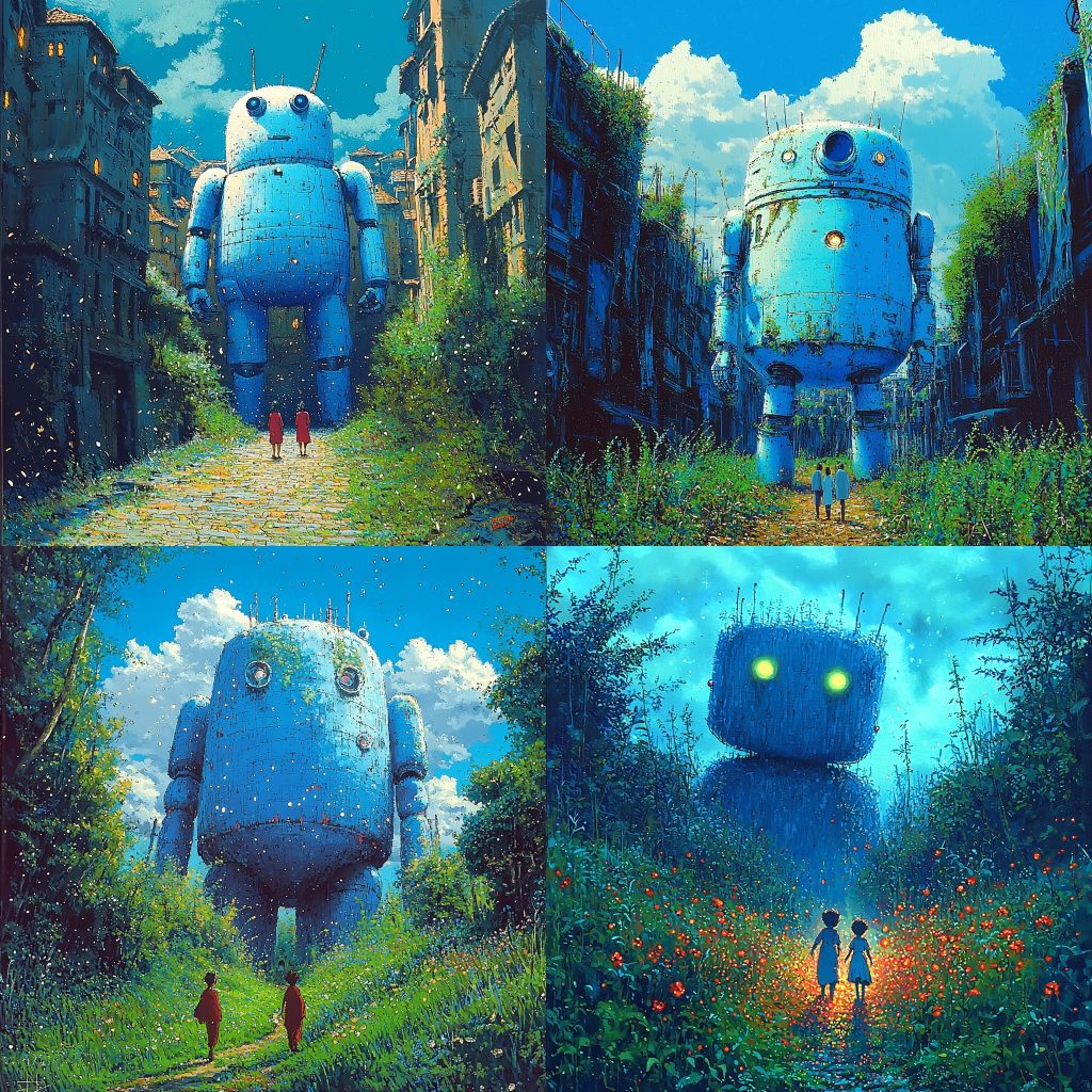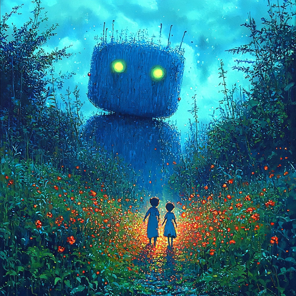 In a world where technology and nature intertwine, two children wander through a glowing path surrounded by vibrant flowers. Their innocent curiosity leads them toward a towering, mysterious robot with luminous green eyes. This scene is more than just a work of art—it’s a vision of how artificial intelligence (AI) and humanity might coexist in the future.